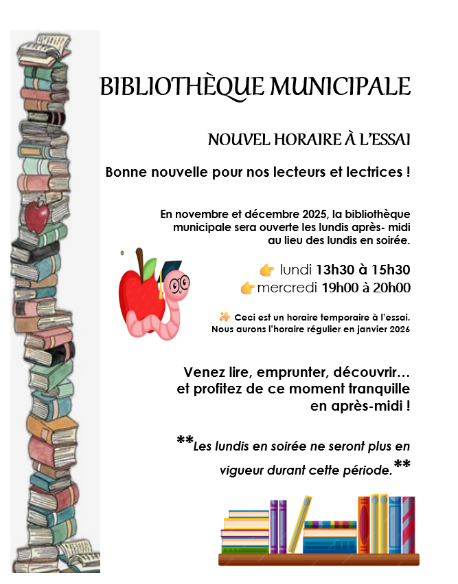 La bibliothèque est ouverte le lundi et mercredi de 19 h à 20 h.