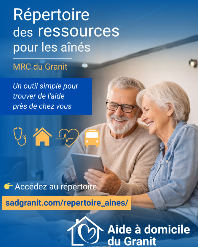 Le Service d'aide à domicile du Granit rend maintenant accessible à la population un répertoire en ligne des ressources pour les aînés de la MRC du Granit, accessible via son site Web.